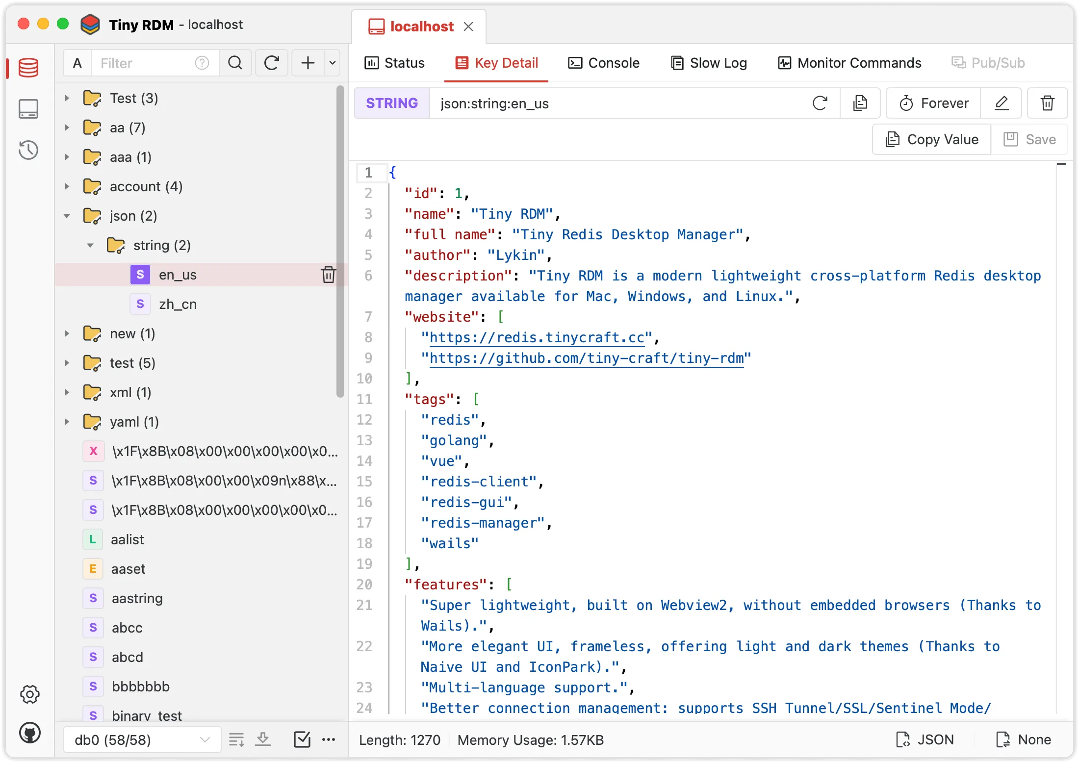 The Tiny RDM application is an open-source, modern lightweight Redis GUI. It has a beautful UI, intuitive Redis database management, and compatible with Windows, Mac, and Linux. It provides visual key-value data operations, supports various data decoding and viewing options, built-in console for executing commands, slow log queries and more.
